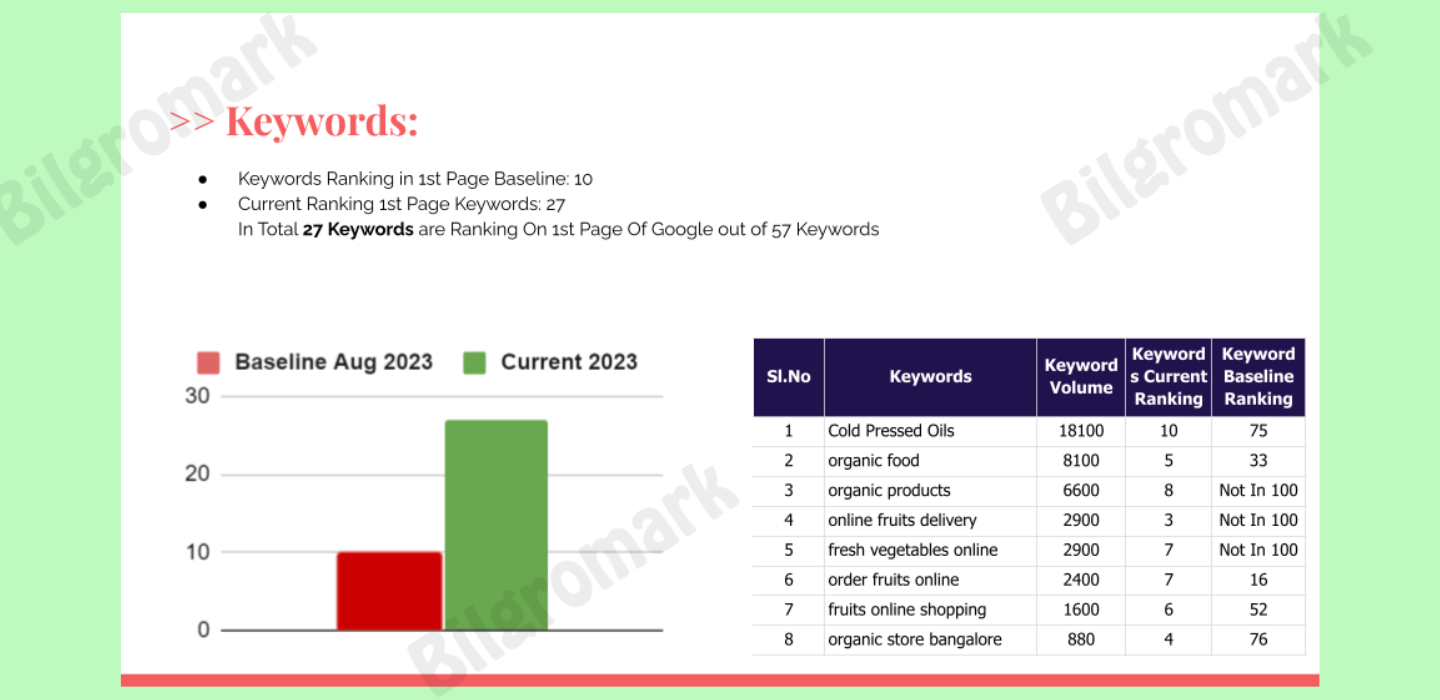 The client, a retailer specializing in organic food products, sought to enhance their digital footprint to attract more customers and increase sales. Initially, only 10 of their targeted keywords were ranking on the first page of Google.